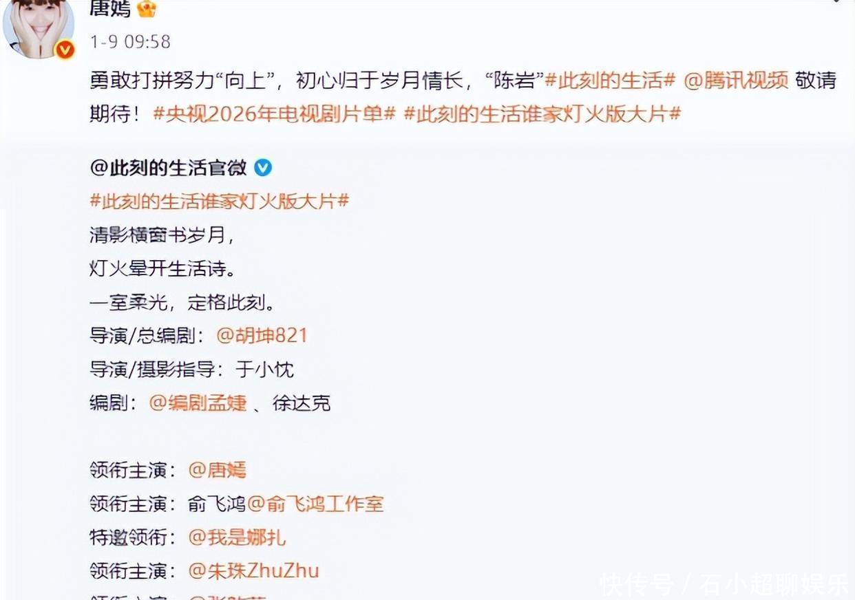 除了时尚圈的表现,唐嫣演艺事业也迎来新突破,官方消息传来,她跟彭冠英合作的新剧《此刻的生活》发了海报。这剧改编自知名小说,里面都是实力派的演员,官方认可唐嫣的业务能力。